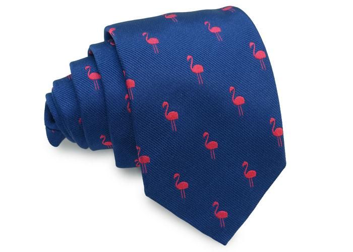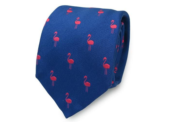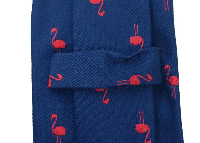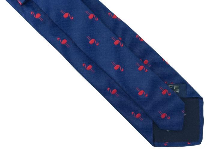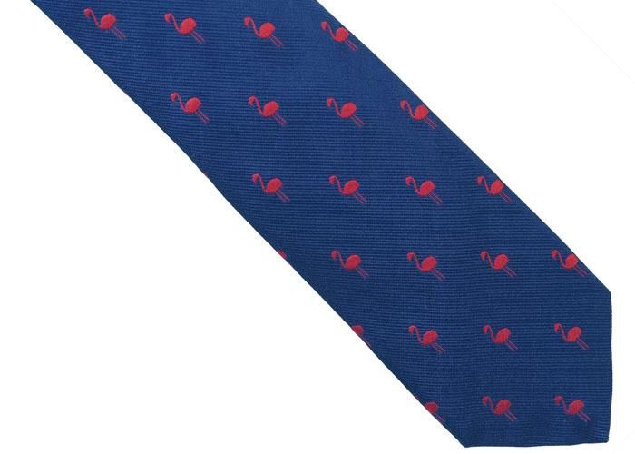 ネイビーに赤いフラミンゴのシルエットが美しいジャガード生地のネクタイ。プリントと違いデザインの凹凸が高級感の漂う仕上がりです。