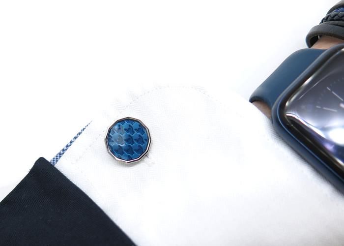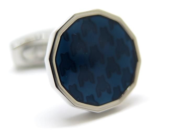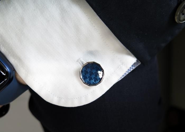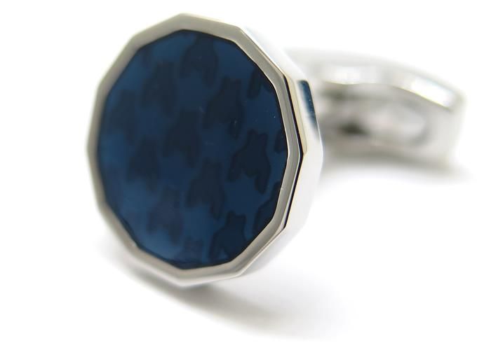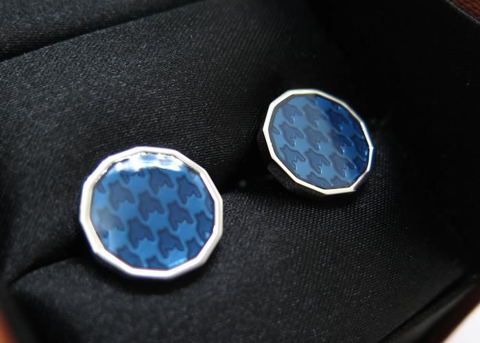 型押しとエポキシ樹脂を使用し、豪華で豊かな現代的なデザインで表現されたカフリンクス。繊細な12面体のデザインには、ジャズ・エイジの香りが漂い、豊かなブルーの下にはドッグ・トゥース(千鳥格子)が描かれています。