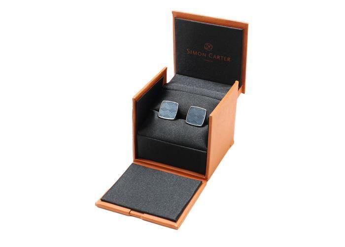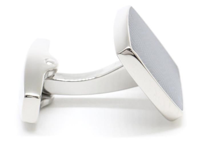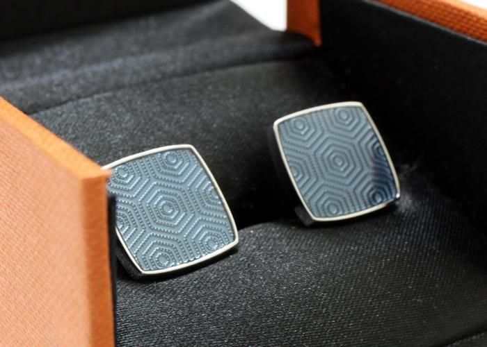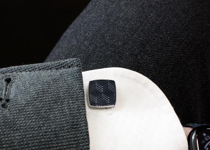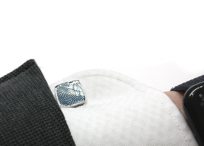 サウスロンドンのミッドセンチュリー様式のマンション内装からインスピレーションを得てデザインされたカフリンクス。繊細な幾何学模様をギローシュ技法で再現し、上からエナメル樹脂を重ねることで奥行きと洗練された質感を表現しました。ケース部分はロジウムメッキ加工された真鍮製で、モダンなスタイルとクラシックなデザインが融合しています。